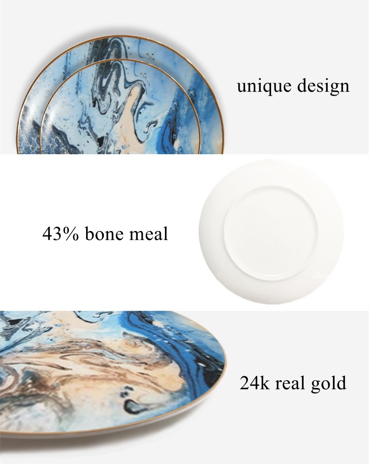 This product is made of fine bone china with exquisite Decal technology.It is very suitable for hotel wedding party. Generally speaking, a set of plates consists of four plates,one charger plate,one dinner plate,one dessert plate,one bread plate. Bone china plate is lighter than ordinary ceramic plate, and the light transmittance is very good. It has a texture as warm as jade. It also has better heat preservation and can maintain the delicious taste of food for a longer time. Bone china plates contain no lead, making them healthier and safer.