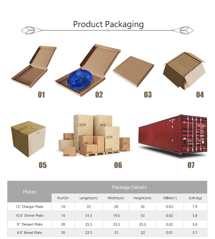 This product is made of fine bone china with exquisite Decal technology.It is very suitable for hotel wedding party. Generally speaking, a set of plates consists of four plates,one charger plate,one dinner plate,one dessert plate,one bread plate. Bone china plate is lighter than ordinary ceramic plate, and the light transmittance is very good. It has a texture as warm as jade. It also has better heat preservation and can maintain the delicious taste of food for a longer time. Bone china plates contain no lead, making them healthier and safer.