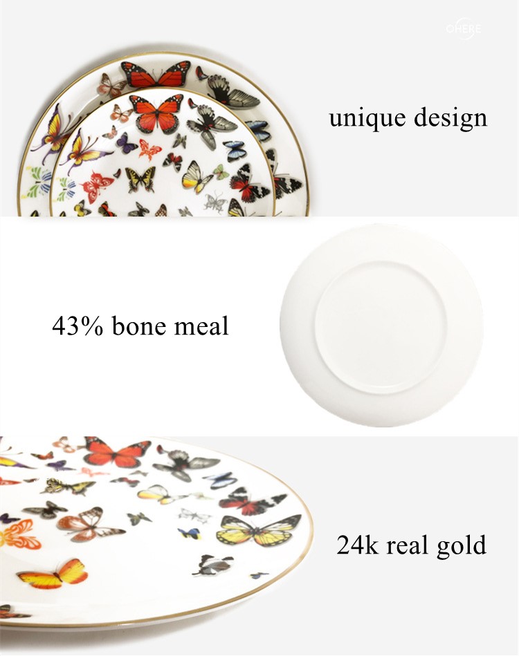 This product is made of fine bone china with exquisite Decal technology.It is very suitable for hotel wedding party. Generally speaking, a set of plates consists of four plates,one charger plate,one dinner plate,one dessert plate,one bread plate. Bone china plate is lighter than ordinary ceramic plate, and the light transmittance is very good. It has a texture as warm as jade. It also has better heat preservation and can maintain the delicious taste of food for a longer time. Bone china plates contain no lead, making them healthier and safer.