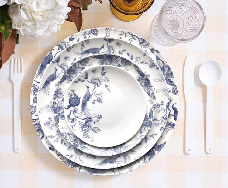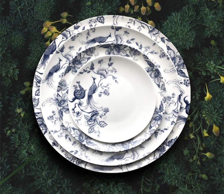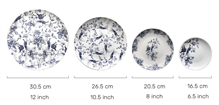 This product is made of fine bone china with exquisite Decal technology.It is very suitable for hotel wedding party. Generally speaking, a set of plates consists of four plates,one charger plate,one dinner plate,one dessert plate,one bread plate. Bone china plate is lighter than ordinary ceramic plate, and the light transmittance is very good. It has a texture as warm as jade. It also has better heat preservation and can maintain the delicious taste of food for a longer time. Bone china plates contain no lead, making them healthier and safer.