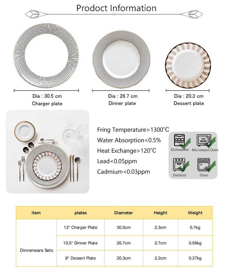 This product is made of fine bone china with exquisite Decal technology.It is very suitable for hotel wedding party. Generally speaking, a set of plates consists of four plates,one charger plate,one dinner plate,one dessert plate,one bread plate. Bone china plate is lighter than ordinary ceramic plate, and the light transmittance is very good. It has a texture as warm as jade. It also has better heat preservation and can maintain the delicious taste of food for a longer time. Bone china plates contain no lead, making them healthier and safer.